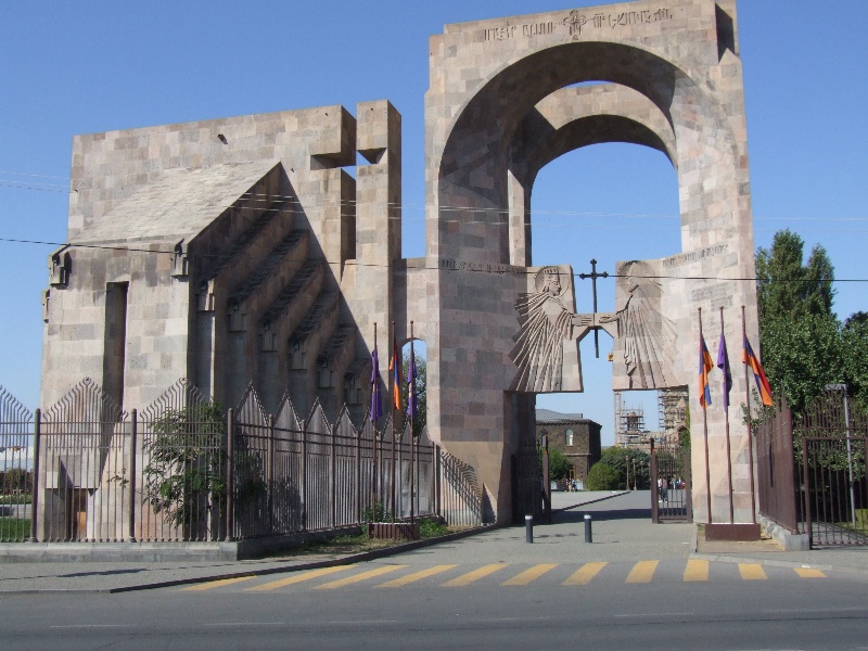 Das erste Ziel, die Kathedrale von Echmiadzin, ist eine gewaltige kirchliche Anlage. Hinter dem modernen Eingangsportal sind nicht nur Kapellen und die Kathedrale, sondern auch viel andere Gebäude. Wir können eine Galerie, ein Museum und eine Lehranstalt erkennen. Hier scheint ein wichtiger Standort der armenisch apostolischen Kirche zu sein. Touristen werden in Bussen angefahren, aber die Anlage ist nicht für touristische Zwecke angelegt und gepflegt.
