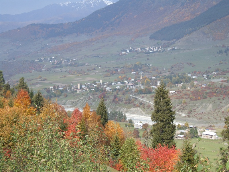 Die Straße nach Ushguli über den Sagara Pass führt durch ein schönes, herbstlich gefärbtes Tal. Kurz vorm Ende des Asphaltes stärken wir uns mit einer schmackhaften Gulaschsuppe. Das war gut, denn die Piste ist recht heftig und mit vielen schlammigen Passagen. An einigen Stellen wird die Piste gerade ausgebaut, das bedeutet, es stehen nicht nur Bagger und Kipper im Weg, sondern der Untergrund ist aufgewühlt und mit groben Steinen übersäht. Es dauert länger als gedacht, ehe wir die Wehrtürme von Ushguli, dem höchtsgelegenen Ort von Swanetien, sehen.