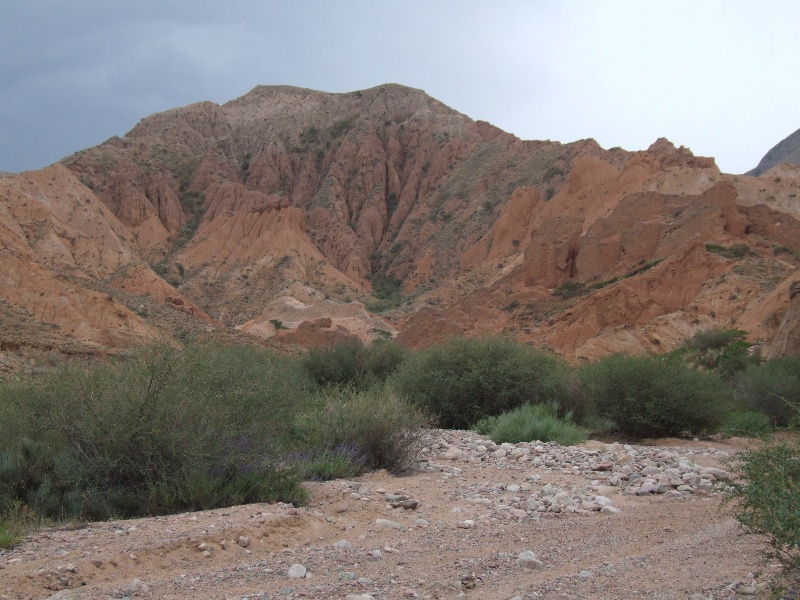 Durch Erosion sind im weichen Sandstein am südlichen Ufer des Ysyk Kul viele Canyons entstanden. Bei Kyzy Suu sind diese Skaska besonders schön. Wir machen eine Wanderung durch die farbigen Schluchten. Das Material ist aber nicht als Stein zu bezeichnen, eigentlich nur mit wenig Lehm gebundener Sand. Das Wasser hat hier beeindruckende Arbeit geleistet. |