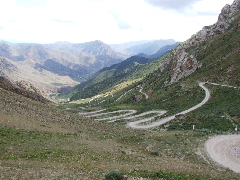 Das erste Ziel in Kirgistan ist der 3816m hohe Pass Chong in Richtung Engilchek und Kahn Tengri Basecamp. Durch die Grenznähe zu China ist hinter dem Pass ein Permit notwendig, so begnügen wir uns mit der Passauffahrt. Oben treffen wir eine Reisegruppe aus Dresden, da wird natürlich länger geredet. Die Aussicht auf die 5000er des Tien Shan ist leider durch aufliegende Wolken nicht sehr gut.