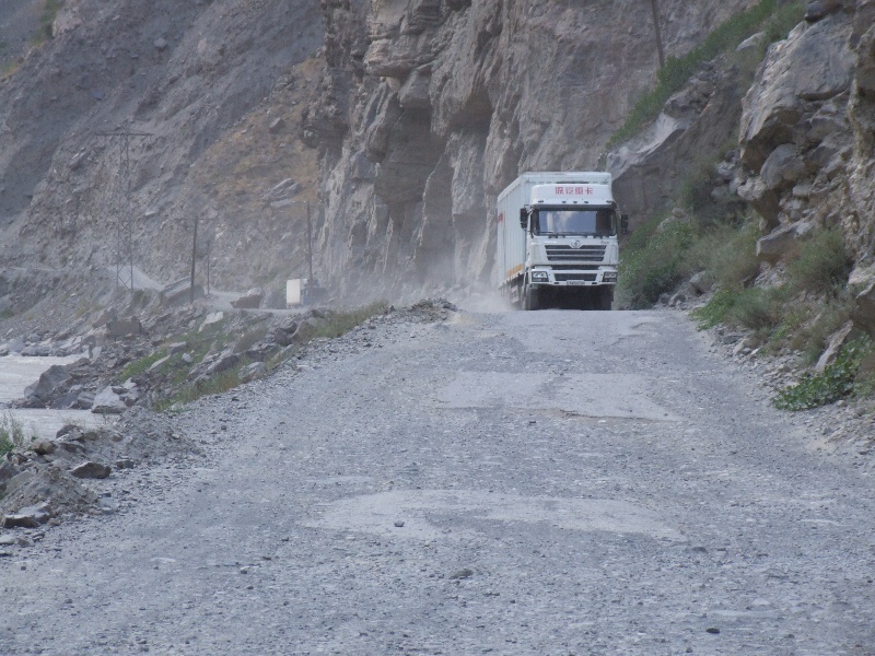 Beeindruckend ist die Landschaft, steile, teilweise senkrechte Felsen mit einem reißendem Fluss im Grund. Wir halten oft, um zu Fotografieren und die bis zu 1000m hohen Wände zu bestaunen. Anders als der Pamir in den hohen Bereichen gibt es hier viel festes Gestein.